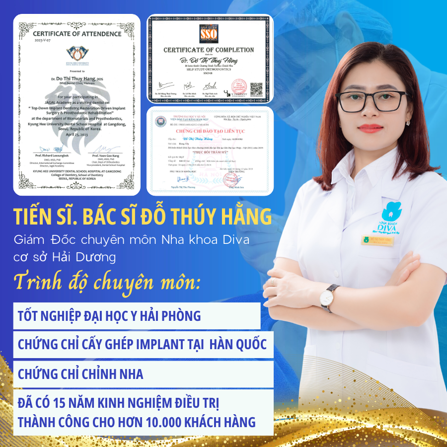 Dr. Đỗ Thị Thúy Hằng, một chuyên gia nha khoa với trình độ chuyên môn vững vàng, đã đưa ra giải pháp và kiến tạo thành công được hơn 10.000 ca khách hàng từ dễ đến phức tạp bằng kiến thức sâu rộng. Ngoài ra, sự tinh tế của bác sĩ Hằng giúp khách hàng có được trải nghiệm hài lòng khi sử dụng dịch vụ tại Hệ thống Nha khoa Diva.